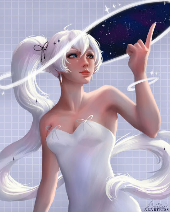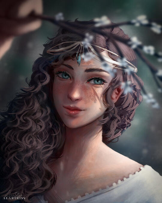 Fully painted and rendered half-body piece. Has a looped animation that lasts from 3 to 10 seconds usually. Common animated elements are hair, particles, eye movement and blinking, subtle head movements. Comes with a simple background - including solid color, mist/sky, or heavily blurred. Can do more complex backgrounds, which will increase the price.